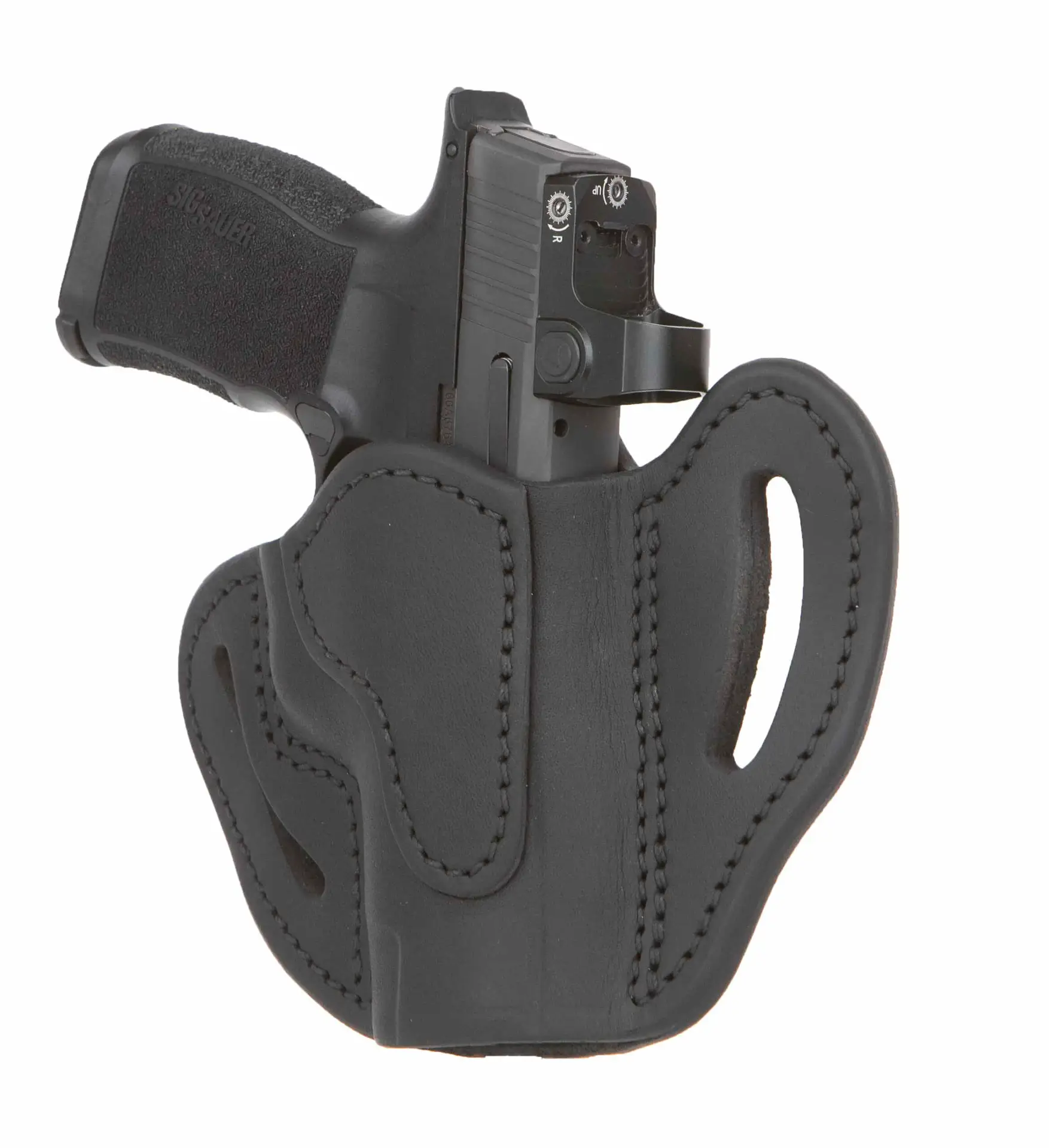 This Open Top Belt Holster Compact, conveniently referred to as the BHC MAX, is hand-crafted from our premium 100% genuine Certified American, Heavy Native Steerhide leather and is thoughtfully designed to support the Glock 48, Sig Sauer P365xl, Springfield Hellcat Pro and similar frames.