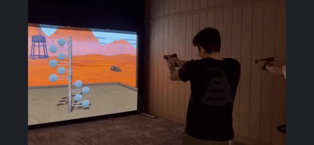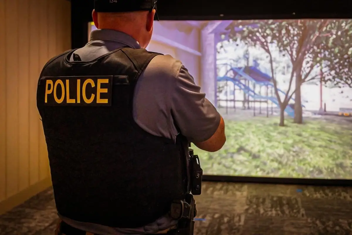 A fully immersive, **no-ammo** environment where you shoot laser-based training firearms at a life-size screen. Scenarios branch based on your decisions. It’s safe, clean, and incredibly realistic.